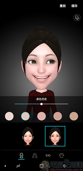 俏皮的 AR 貼圖在 Galaxy A9 上也可以做喔!切換到這個模式後,只需點選「建立虛擬人偶」掃描臉部後,就可以進入到選擇膚色、髮型、性別、服裝,你還可以對臉部進行細部微調,接下來就可以將你的表情做成可愛又個性化的動態貼圖,還能用通訊軟體傳給朋友呢!下面我也挑了六組表情來跟大家分享一下。