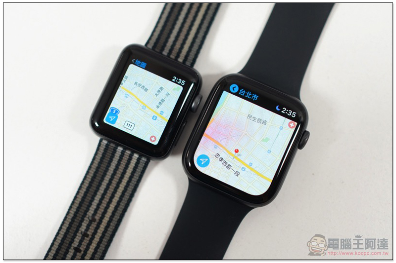 由於小編先前使用的是 38mm 的 AW3,所以對比之下真的會覺得兩者的螢幕大小真的有著超大幅度的增進 — 當然… 這是最極端的例子啦,不過個人是真的很滿意 — 特別是看到地圖 app 的顯示(如下)還有訊息通知等,就真的覺得 Apple Watch Series 4 的更大螢幕對於顯示無論是更放大元件,或者是可以一次看到更多字元,都有著相當有感的升級。這也是這次 AW4 最吸引筆者會想要購入的優點之一。