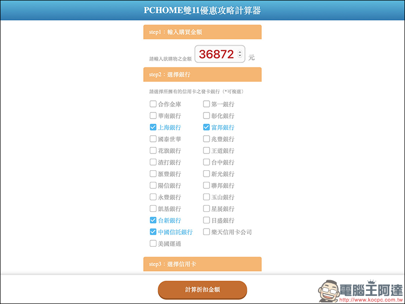 接著開啟這個「PChome 雙11優惠攻略計算器」,首先輸入欲購買的商品金額,接著選擇自己所擁有的信用卡之發卡銀行(可複選):