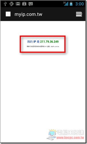 STEP2.請注意在使用mCool連線成功後請開啟http://myip.com.tw檢查iP是否為211.79.36.249,如果ip正確的話,那麼不管您怎麼上網如何下載檔案每個月結算只要299元!但請跟中華電信客服再三確認已經關閉該門號inetnet的APN服務(只保留mCool服務),否則費用會大增!