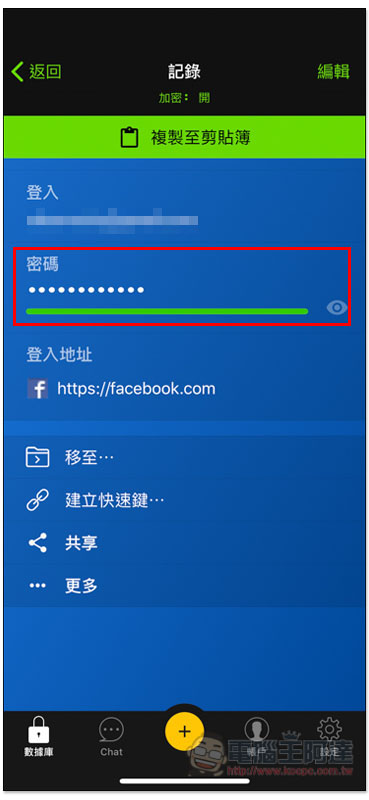 下圖是主畫面,數據庫會顯示你已經建立好的密碼資訊、Chat 需另外安裝別的 App、+ 則是開始建立: