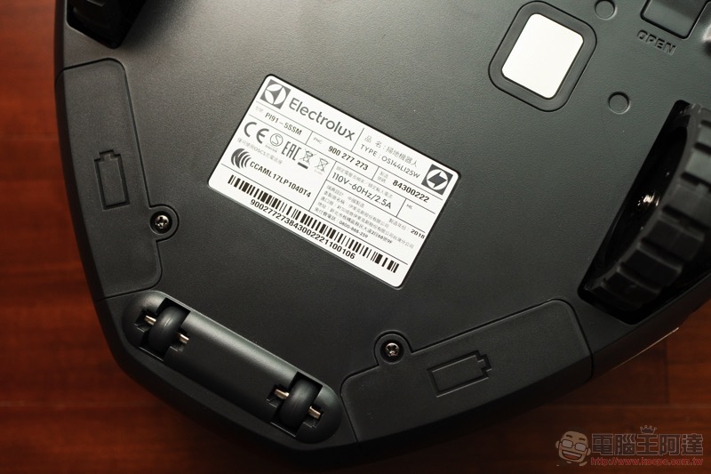 再翻回底部,除了可以看到超大可以翻越 2.2cm 硬質段差與 2.4cm 地毯的動力輪外,也看到了位在兩側邊緣的電池蓋設計: