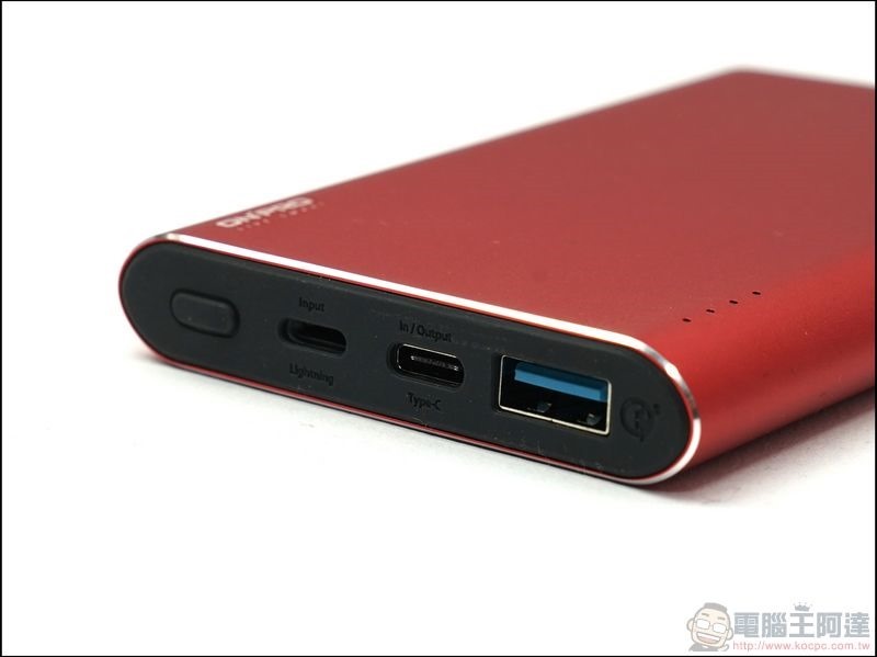 在 ONPRO MB-IX10 的前端可看到電源鍵、Lightning 接頭 INPUT(可使用 iPhone 傳輸線以 2A 的電流進行充電)、TYPE-C 連接埠(雙向 3A 輸出/輸入)與 TYPE-A 連接埠(支援 5V/3A、9V/1.8A、12V/1.3A QC3.0格式輸出),幾乎你想的到的行動裝置 MB-IX10 都可以幫他充電,此外閃亮亮的 CNC 鑽石切邊工藝讓人第一眼不注意到也難: