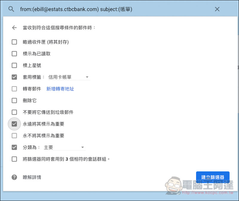 再來就是動作,以我設置的中國信託郵件為例,我希望會自動進到信用卡帳單的標籤裡,然後標示重要(要繳費絕不能忘)、分類也位於主要,這樣未來收到中國信託寄來的郵件,且符合觸發條件,就會自動進行上面這些動作,不用手動操作: