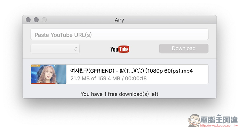 操作相當簡單,安裝完 Airy App 後將其開啟,在欄位貼上欲下載的 YouTube 影片連結。: