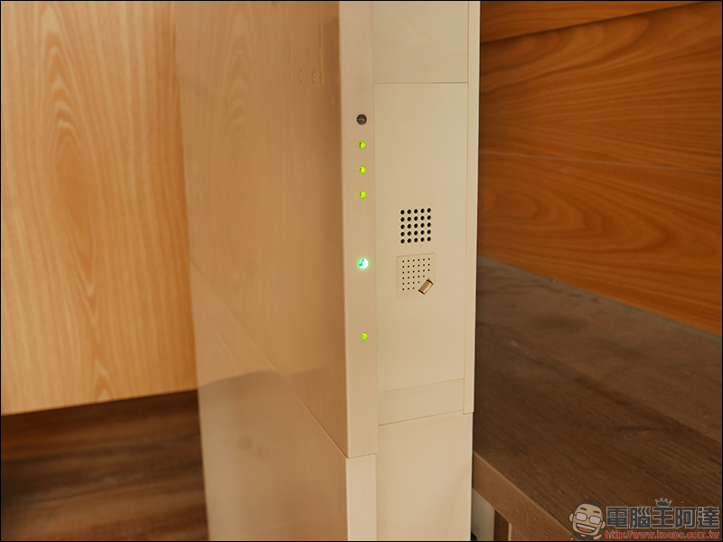 在機身側邊可以看到多顆燈號。由下往上,最底部為 APP Wi-Fi 連線指示燈,第二個比較大的是 PM2.5 狀態指示燈,中間三顆則為風量指示燈,最上方是濾網髒污警示燈。