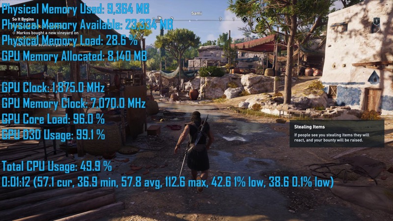 首先是遊戲 RAM 使用率。下方所有測試都是在 Intel Core i9-9900K,32GB DDR4-3400 RAM 以及 GeForce GTX 2080 Ti 的環境下完成,另外測試時,系統背景也有一些程式正在運作,如:Steam,Origin、Uplay、Battle Net、Epic Games Launcher、Discord,Chrome(打開幾個標籤頁)、MSI AfterBurner、RivaTuner、Fraps。