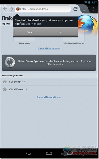 Firefox Android版在平板上的表現非常好,不但瀏覽順暢、還可以正常顯示FLASH內容,我個人覺得唯一可惜的就是無法隨時與桌機版的Chrome書籤同步與沒有中文化,只能與自家的Firefox書籤同步(Opera也是如此,這些大廠都蠻堅持的),不管您是不是Android平板玩家,個人都建議大家可以改用Firefox 來當預設瀏覽器喔!