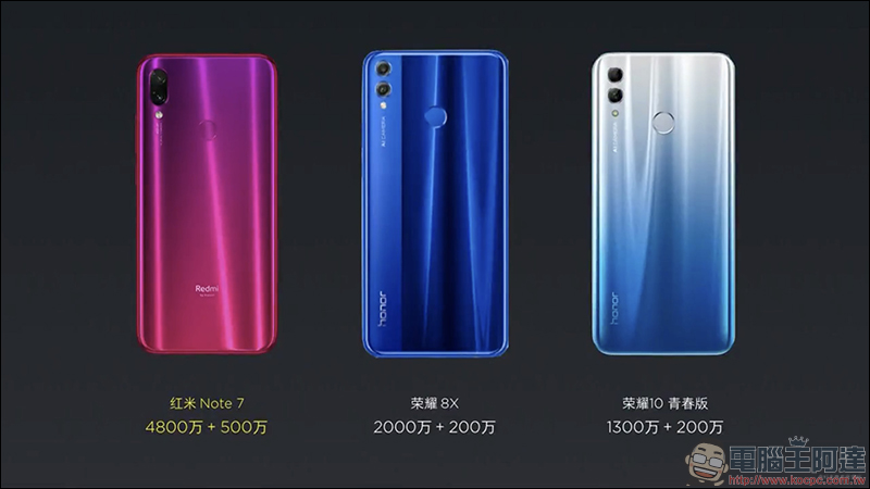 舉紅米 Note 7 和兩款競品的後置相機配置比較,紅米 Note 7 搭載 4800 萬像素+500萬像素都勝出。