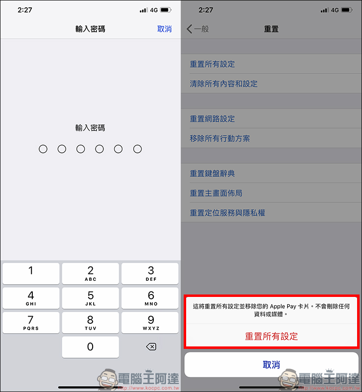 重置前要先輸入一次 iPhone 的密碼,接著選擇「重置所有設定」。