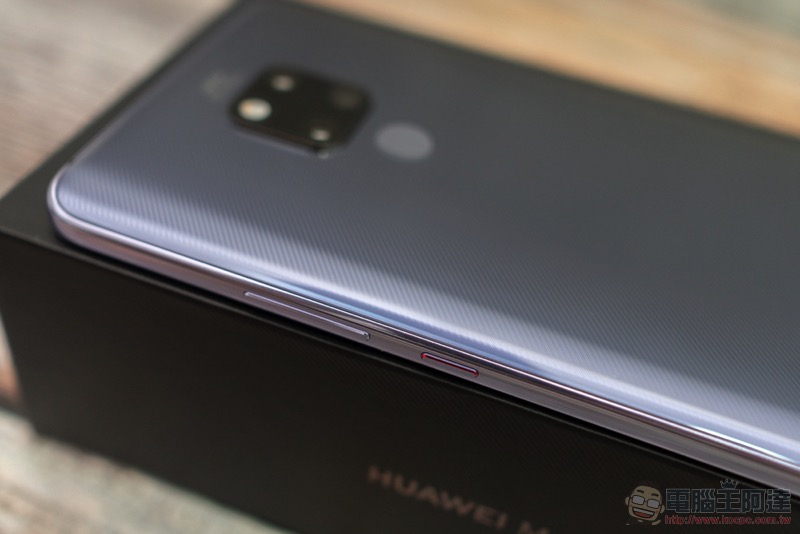 Mate20 X 的按鈕都集中在了螢幕右側邊框之上,除了有著一圈紅色的電源鈕外,音量按鈕則都是與金屬邊框保持著一致的色系。此外,在此角度更可以看出背殼的雙曲面曲線,也是相當漂亮: