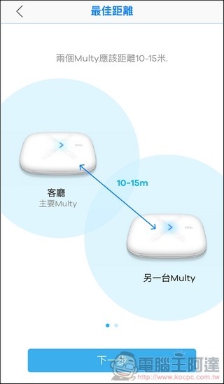 接著可以馬上設置下一台的位置,雖說一台Multy Plus的有效範圍是70坪,但無線訊號怕的就是各種阻隔與干擾,就好比小編在測試的時候,30幾坪的空間內,在客廳只架設一台Multy Plus的情況下,在臥室內的無線訊號就會變得較弱,雖不能說慢,但總是會有些遺憾,因此要讓訊號在使用空間內都可以暢行無阻,第二台的設置位置就很重要: