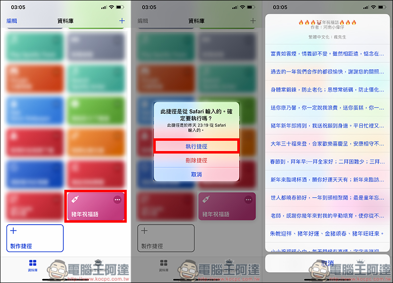 豬年祝福語 Siri 捷徑腳本下載完成後,開啟捷徑 App 點選「豬年祝福語」按鈕,當畫面出現執行確認畫面時點選「執行捷徑」就會看到滿滿的應景的豬年新年吉祥話: