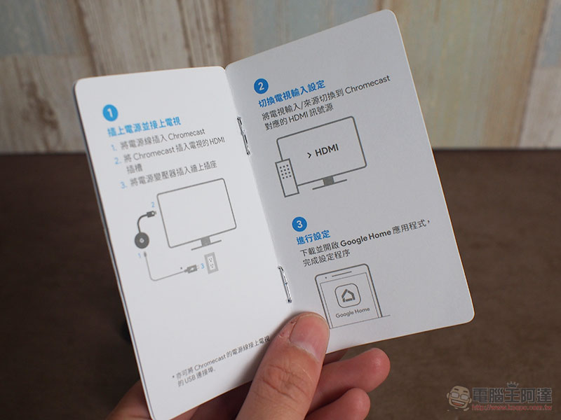 盒中內容物也相當簡單,一個 Chromecast 本體,一條電源線與一個變壓器,另外就是薄薄的說明書與注意事項小手冊