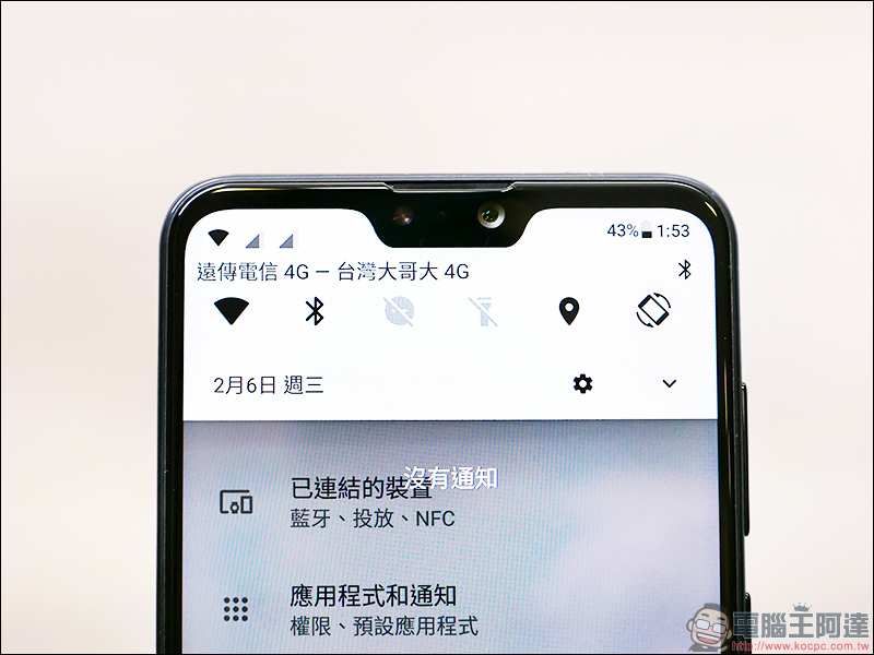 螢幕頂端除了 1300 萬畫素、f/2.0 大光圈的美顏自拍鏡頭外,也配置了 LED 的柔光補光燈:
