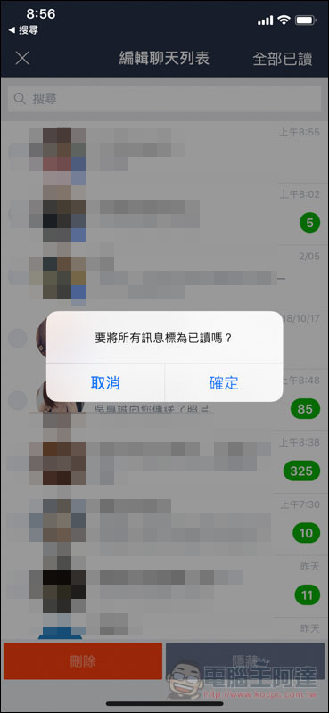 按確定後,幾百、幾千、甚至幾萬條未讀訊息瞬間都變已讀,立刻還你清幽的 LINE 環境: