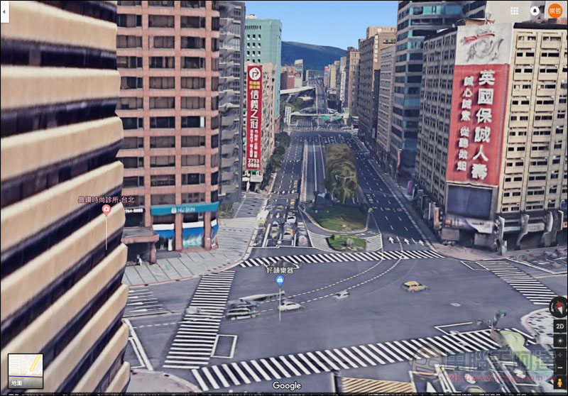 如下圖,是不是非常壯觀,沒想到街景 3D 化後,竟然這麼有趣!另外附近的相關景點也會用小圖示標示出來:
