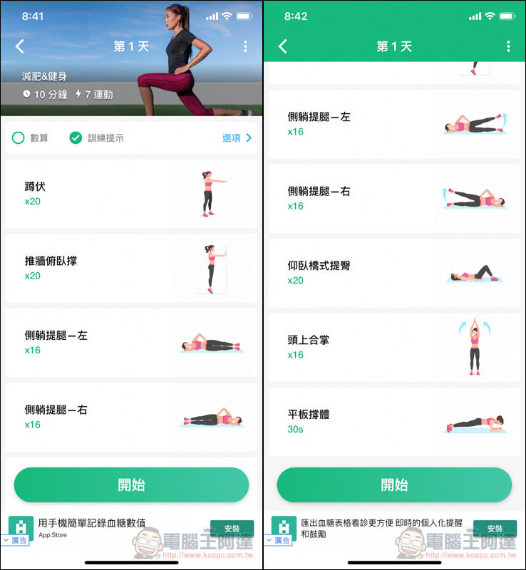 開始前會先告訴你有哪些訓練動作,跟其他同類型 30 天的健身 App 相比,這款算是比較輕度,花的時間也不會長: