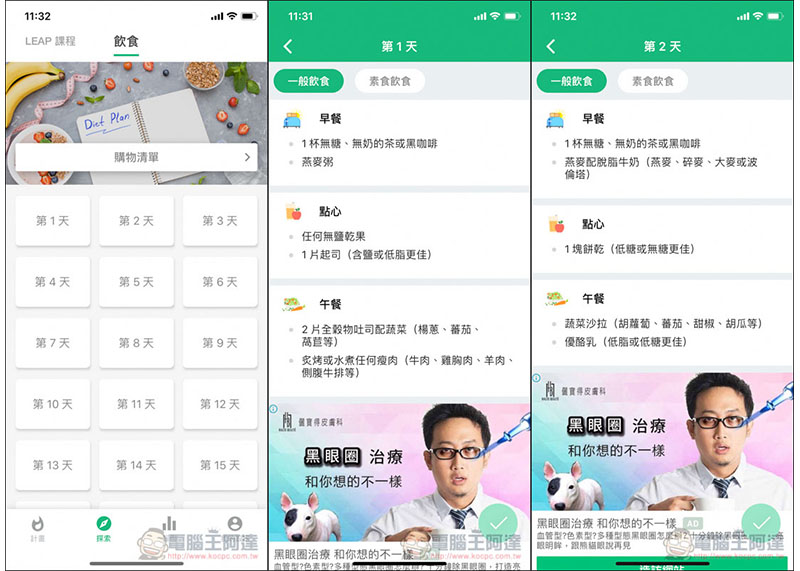 對於真心想減肥、減重的人,除了運動外,飲食控制也很重要,如果不知道怎麼吃才好,這款 App 也有提供 30 天的早中晚餐,以及點心食物建議,很值得參考: