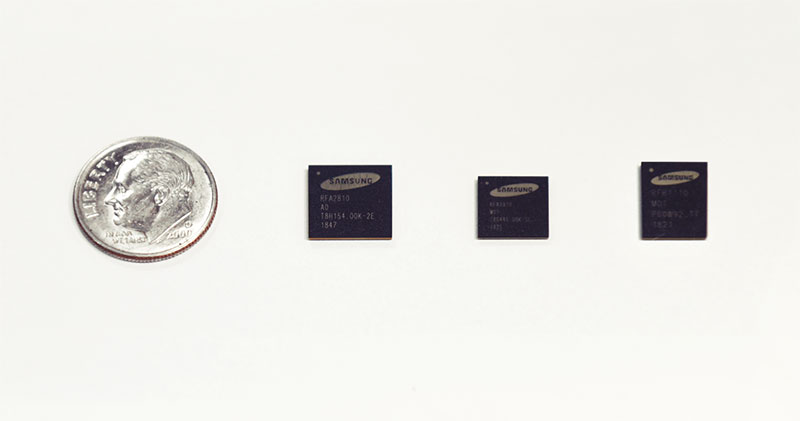 為實現超高速的數據傳輸,5G 基地台搭載將近 1,000 個天線元件和多個 RFIC 以充分利用 mmWave 頻譜。在減少基地台的體積和功耗上,RFIC 扮演著至關重要的角色。三星新一代 RFIC 採用 28nm CMOS 半導體技術,能支援高達 1.4GHz 的頻寬運作,而前一代的 RFIC 則為 800MHz。RFIC 的尺寸減少 36%,並且藉由降低噪音系數和提升 RF 功率放大器的線性度來提升整體效能表現。