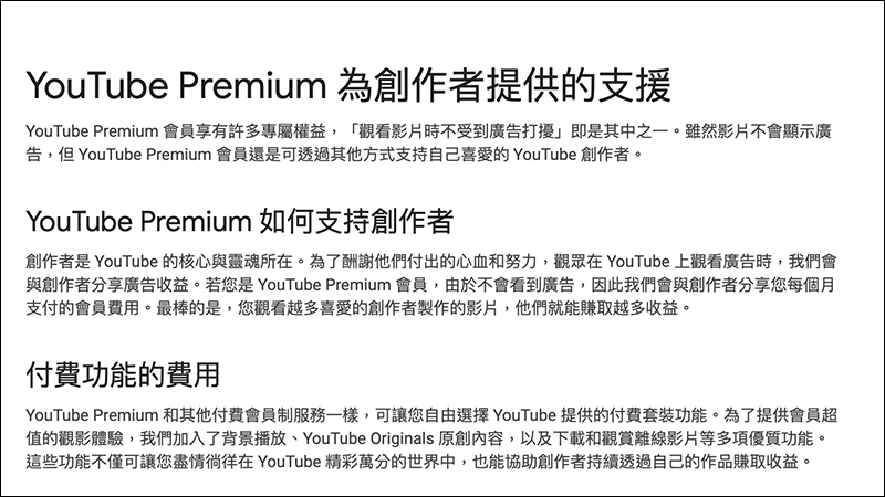 根據 YouTube 官方的說明,如果是YouTube Premium會員,由於用戶不會看到廣告,因此 YouTube 官方會與創作者每月支付的部分會員費用給創作者,對於用戶本身和創作者都不會受影響的: