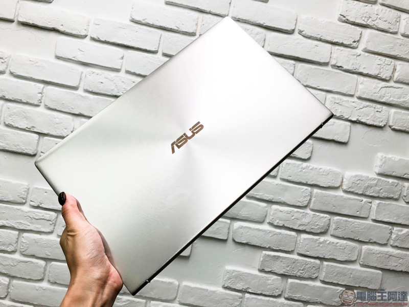 這次開箱的冰柱銀 ZenBook 13 極美無限,眩目耀眼的同心圓光波彷彿星河流動,隨著電腦移動角度,光波流轉像是時光緩緩前進時移動著的點點繁星,因為時間推移的速度而連成一線,中間的 ASUS 字閃耀亮澤,細緻漂亮,並非只是單調的純色,而是有不同層次與色澤的漂亮光暈。