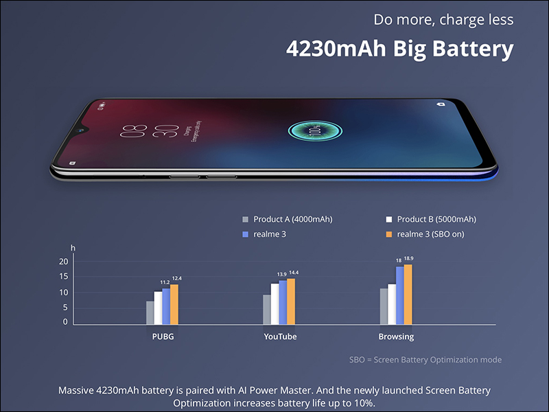 針對平價手機使用者相當在意的電池續航力方面, realme 3 內建 4,230mAh 的大容量電池,搭配螢幕電池優化模式( Screen Battery Optimization mode,以下簡稱 SBO 模式)可有效提升手機使用續航力。根據官方數據顯示, realme 3 在一般模式下觀看 YouTube 影片約可使用 13.9 小時,其實已經相當不錯,但開啟 SBO 模式後最長可觀看 14.4 小時: