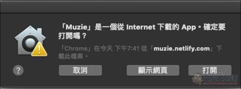 Muzie 並沒有在 App Store 上架,須至開發者官網下載。下載後打開,把 App 拖拉到右側 Applications 即完成安裝: