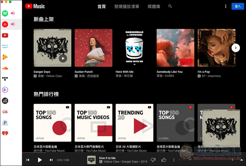 YouTube 就沒問題了,對於經常用 YouTube 聽歌的人,還蠻推薦使用這套,這樣不僅不會佔你瀏覽器的分頁,聽膩想用其他服務時也能快速切換: