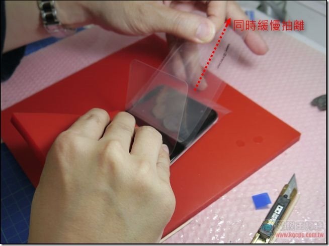 接著順著手機螢幕末端的方向一邊以工具推平,同時又抽離上面的原PE膜,這樣的用意就是確保不會有任何空氣中的微塵有機會沾到螢幕上,這樣的施工手法是有申請專利的(專利所屬:利達國際開發企業有限公司):
