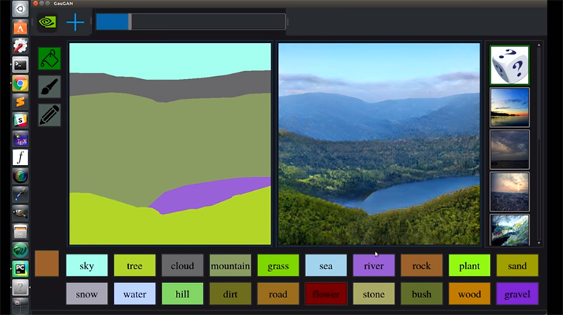 在 GauGAN 研究工具中以預先學習龐大資料量的模型為基礎,在工具板上提供各種色彩與物件對應的選項,使用者可藉由選擇這些代表物件、場景的色塊在畫布上繪圖,例如紫色代表河流、灰色代表雪、綠色是草(見下圖),在持續變更色塊、顏色的繪圖過程中,AI 會藉由這些條件來生成不同的影像,甚至可以隨著顏色的堆疊替換來變更影像呈現成果。