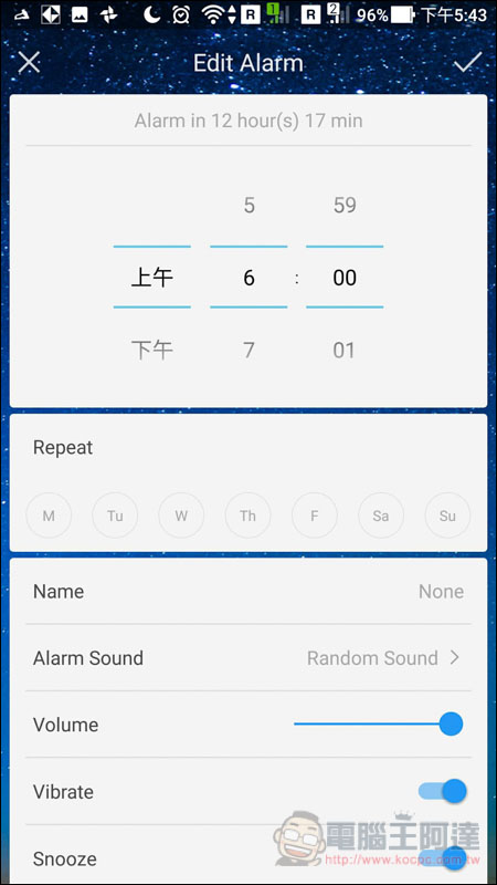 跟大多數同類型 Apps 差不多,可設定要不要重複、震動是否開啟、小睡片刻等等: