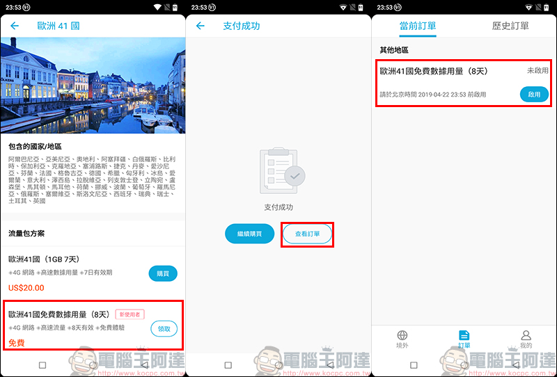 進入頁面後,找到新使用者專屬的「歐洲41國免費數據用量(8天)」方案,此方案可享有 8 天有效的免費 4G 上網,點選「領取」。接著畫面會顯示支付成功,可前往「查看訂單」確認領取狀態。領取完成後,等待抵達目的地再開啟 App 頁面將它「啟用」就能開始上網囉!