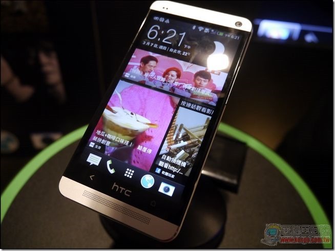 新 HTC ONE的機身正面上方配置了210畫素鏡頭、接近與光感應器之外,聽筒與下方的位置的喇叭內建了使用「HTC BoomSound™ 音響」立體聲喇叭,也是全世界第一支機身正面內建左右聲道喇叭的手機,在會場有點吵雜,但簡單聽音效感覺很宏亮與清脆: