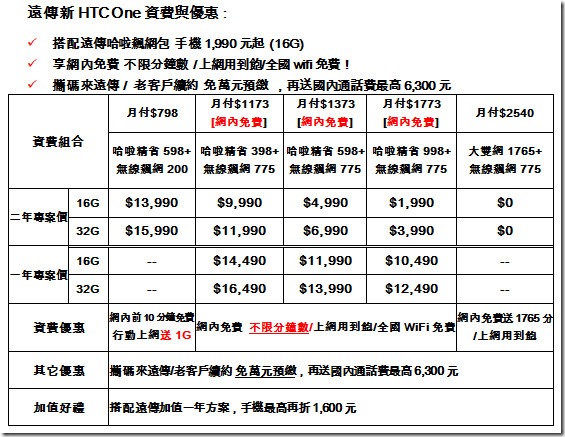 在此附上中華電信、台灣大哥大、遠傳電信與威寶電信等四大電信業者的「新 HTC ONE」資費方案組合清單給大家做參考,您可以依照現在的電信公司搭配方案購買會便宜很多,比較奇妙的是64GB版本只有威寶電信有,空機價格則跟筆者之前所推測的16GB/19900元、32GB/21900元、64GB/24900元完全一致: