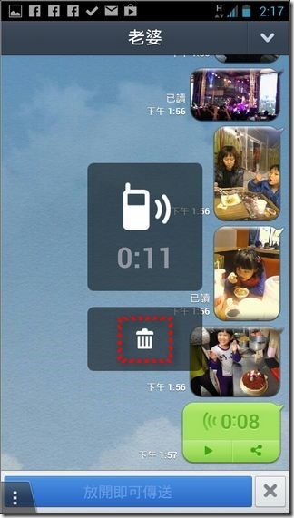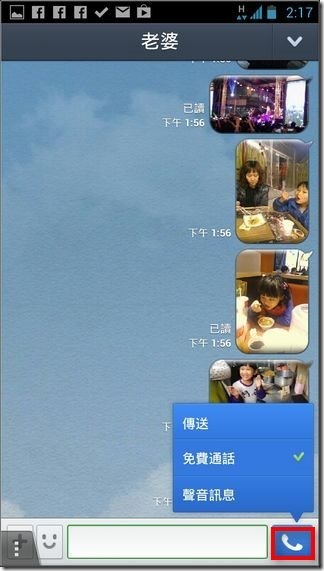 右下角的傳送功能圖示改為長按不放後可以切換「傳送」(文字訊息)、「免費通話」(網路電話)與「聲音訊息」(錄音傳送)等功能,不用再從「+」中選擇了: