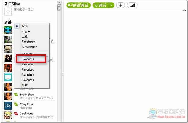 要回到之前的群組列表只要點擊群組名稱旁的箭頭就可以了,順便說明一下,「全部」就是所有IM聯絡人的大雜燴(預設)、「Skype」是Skype的原聯絡人、「Facebook」則是臉書的朋友清單、「Messenger」是MSN聯絡人(一樣沒分群組),可以切換顯示: