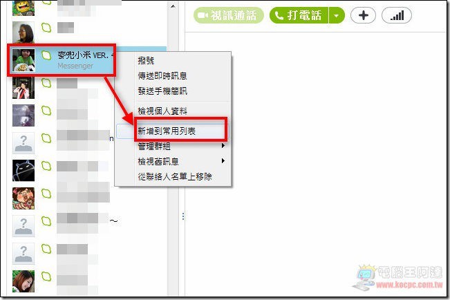 其實MSN常哈啦的朋友就是那幾個,剩下大都是別人主動敲的。所以常扯蛋的朋友可以將其新增到「常用列表」中,這樣要找人也比較快。只要在該聯絡人上方按下滑鼠右鍵—>「新增到常用列表」: