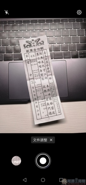 接著介紹的是很實用的文件調整,只要拍攝有字的紙張,就會自動轉成只有文件的畫面,非常聰明;即便故意放在方形的東西上拍攝試圖誤導相機,它還是完美達成任務了。