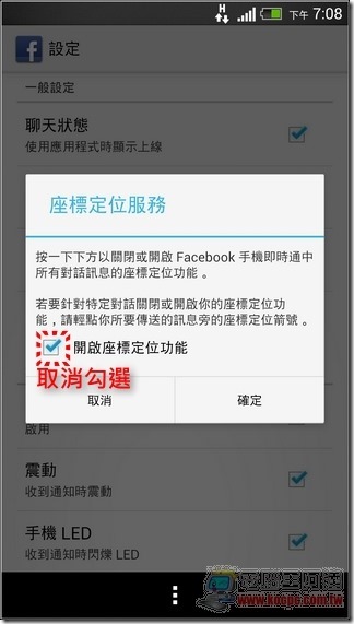 先預設的座標定位功能取消勾選關閉後,點擊「確定」,只要看到「即時通定位服務」關閉了即可,這樣不管進入任何聊天室都不會啟動GPS功能了,但打卡還是會啟動GPS喔(此選項我在iOS版上找不到,如果有人知道怎麼關閉請告知,謝謝):