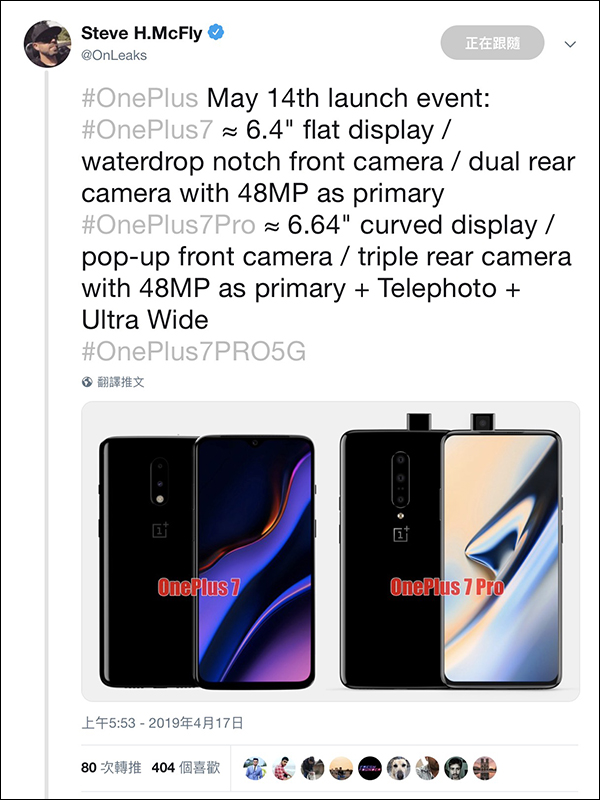 根據爆料大神 Steve H.McFly(@Onleaks)的最新爆料, OnePlus 將在 5 月 14 日舉辦新機發表會,屆時將會推出全新 OnePlus 旗艦手機 OnePlus 7 系列。在今年無論是三星、華為皆推出多款不同定位的旗艦級手機, OnePlus 也將揮別過去半年推出一款手機的慣例,將一次多出多款新機以滿足不同預算的消費者。