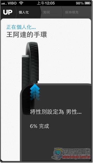 接著設定配戴者的E-Mail與密碼,建立您專屬的UP雲端帳號,您日後就算換手機也不會影響資料的正確性,最後App會將相關資訊與UP智慧手環進行同步與設定:
