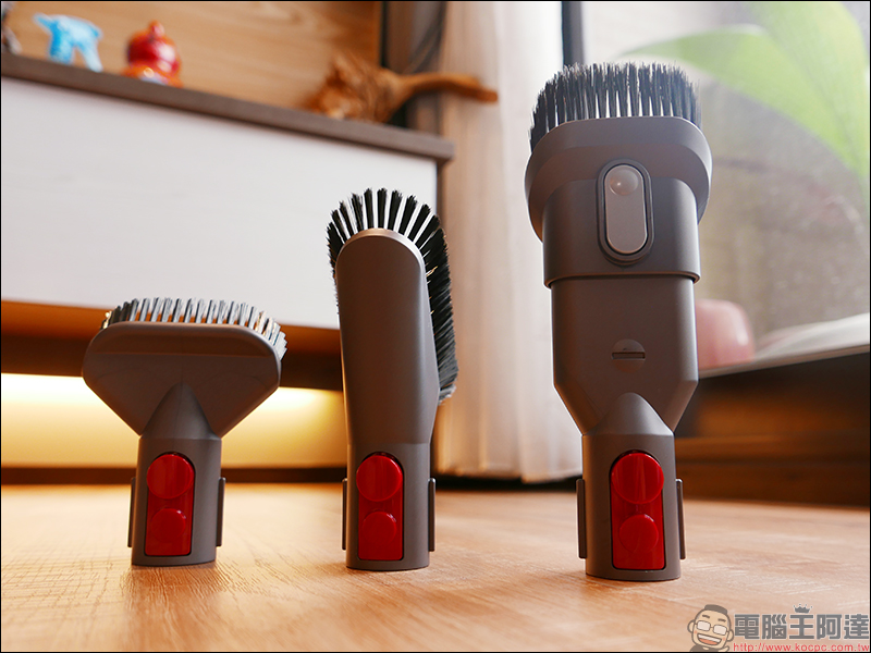 除了高扭矩吸頭,去年推出的 Dyson V10 Cyclone 內含的軟質碳纖維滾筒吸頭、迷你電動渦輪吸頭、二合一組合式吸頭、細縫清潔吸頭、迷你軟質毛刷吸頭,以及硬漬吸頭也在 V10 absolute 列為標準配備。首先看到三款吸頭由左至右分別為「硬漬吸頭」、「迷你軟質毛刷吸頭」和「二合一組合式吸頭」: