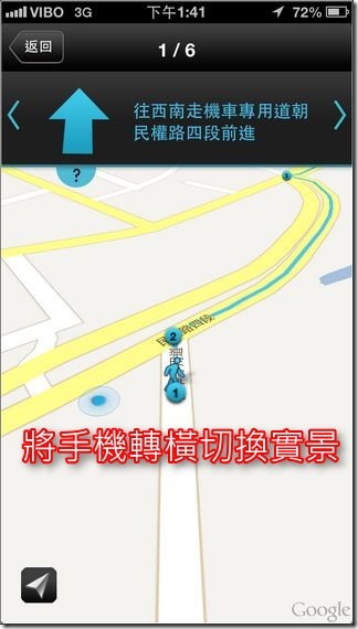 選擇路進路線後App會以1、2、3…的步驟指引使用者,在這個時候請將手機轉橫,就會切換成實景圖模式: