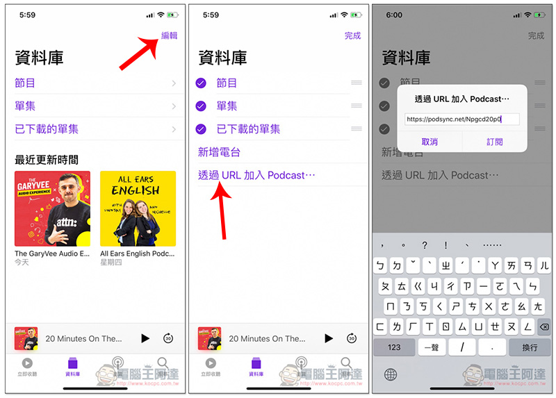 接著打開 iOS 內建的 Podcast App(其他任何第三方 Podcast App 也行),在資料庫選單中點選右上角的 ”編輯“,就會找到 “透過 URL 加入 Podcast“,把剛剛取得的連結貼上,並按下訂閱: