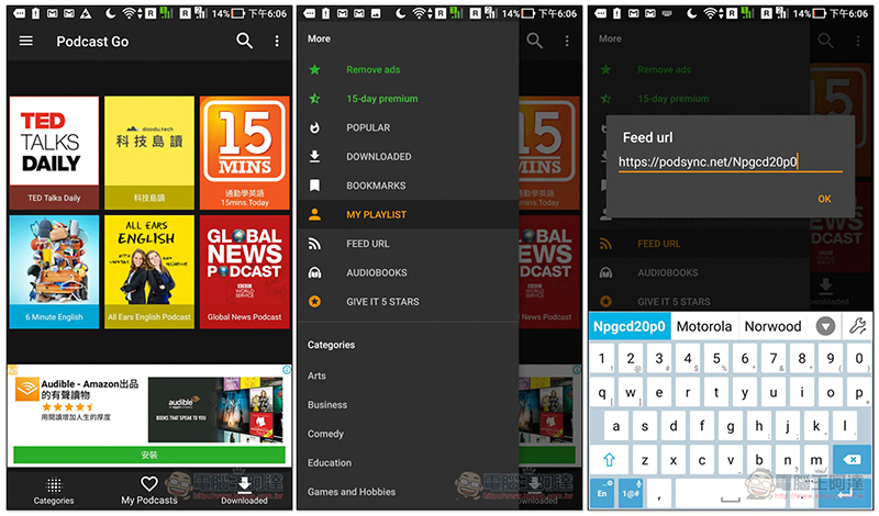 Android 部分怎麼取得 YouTube 頻道連結跟利用 Podsync轉換這我就不多作介紹,還不清楚的人參考上方 iOS 的步驟。我以 Podcast Go 這套為例,點選首頁左上角選單,即會找到 FEED URL,把轉換過的 YouTube 頻道連結貼上: