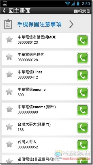 以第一個「電信商、手機3C」類別來說,裡面除了整理得相當詳細的各電信業者客服專線,最上方還有手機保固的注意事項可以參閱:
