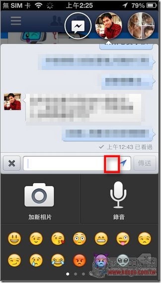 而比較令人矚目的大頭貼功能在筆者的iPhone5與iPad上並還沒有看到,猜測跟說明的一樣是逐步開放,在iTunes的範例途中可看到在文字輸入欄位多了一個表情符號,這功能擺明了向LINE致敬,這個功能相信在Android下一版的更新也會出現,是否是因為LINE在北美地區大軍壓境給Facebook一些壓力,這就不得而知了: