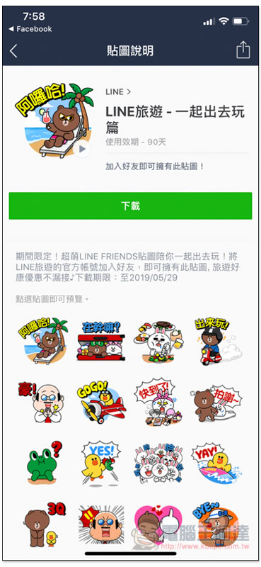進入貼圖頁面後,上方就會顯示活動說明,只要加入 LINE 旅遊的官方帳號好友,即可擁有這組LINE旅遊 – 一起出去玩篇免費貼圖,全部都是動態貼圖,且必須於 2019/05/29 之前下載才行。而使用效期則是 90 天,雖然不是永久,但 3 個月我覺得也夠了,畢竟 LINE 幾乎每個月都有不少免費貼圖活動: