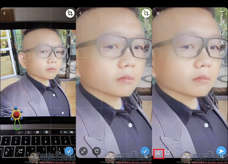 也許大家也會發現到這款童顏濾鏡在畫面中會有個玩具懸浮在畫面中有些礙眼,其實只要在 Snapchat App 內就能直接透過畫面裁切避開,這裡就讓電腦王阿達的照片來示範吧!(笑)